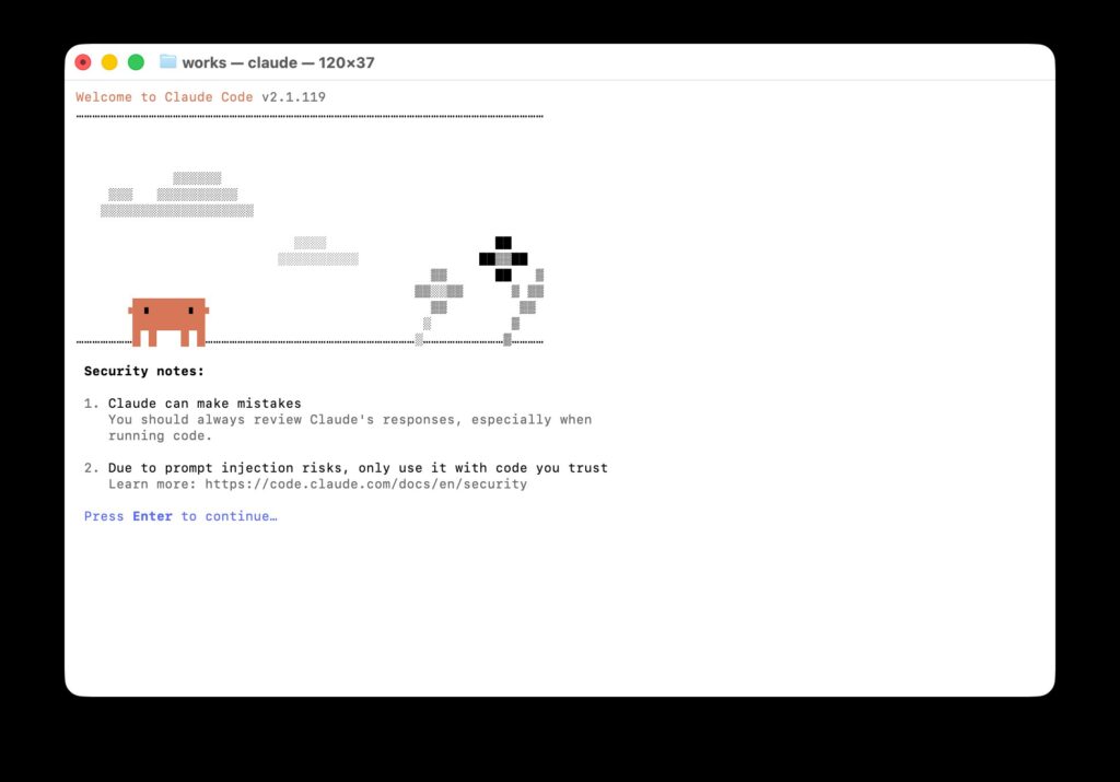 認証完了後、Claude Code 利用時の注意事項が表示されます。一読して Enter で進みます。