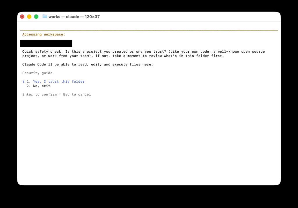 次に表示される「フォルダ信頼確認」では、Claude Code が読み書きするスコープを決めます。ホームディレクトリ(/Users/<username>)で起動するとそこ全体が作業対象になるため、.ssh や .aws などの機密情報まで Claude Code のスコープに入ってしまいます。
