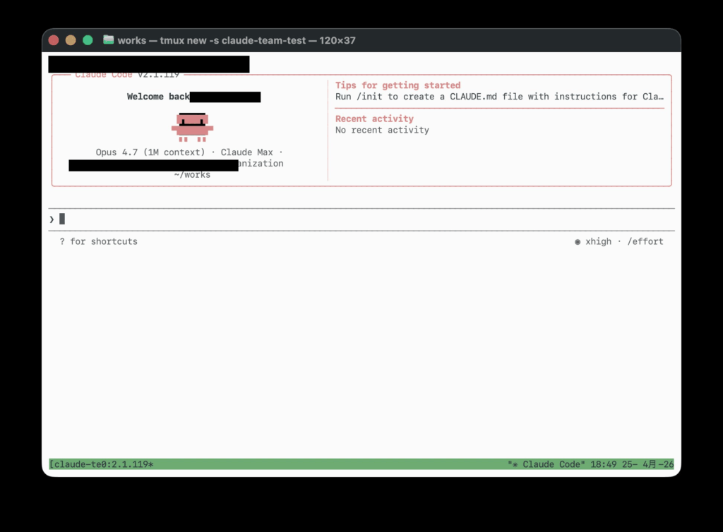 tmux 内で Claude Code が起動した状態がこちら。画面下部の緑色のステータスバー([claude-team-test])で tmux セッション内であることが分かります。