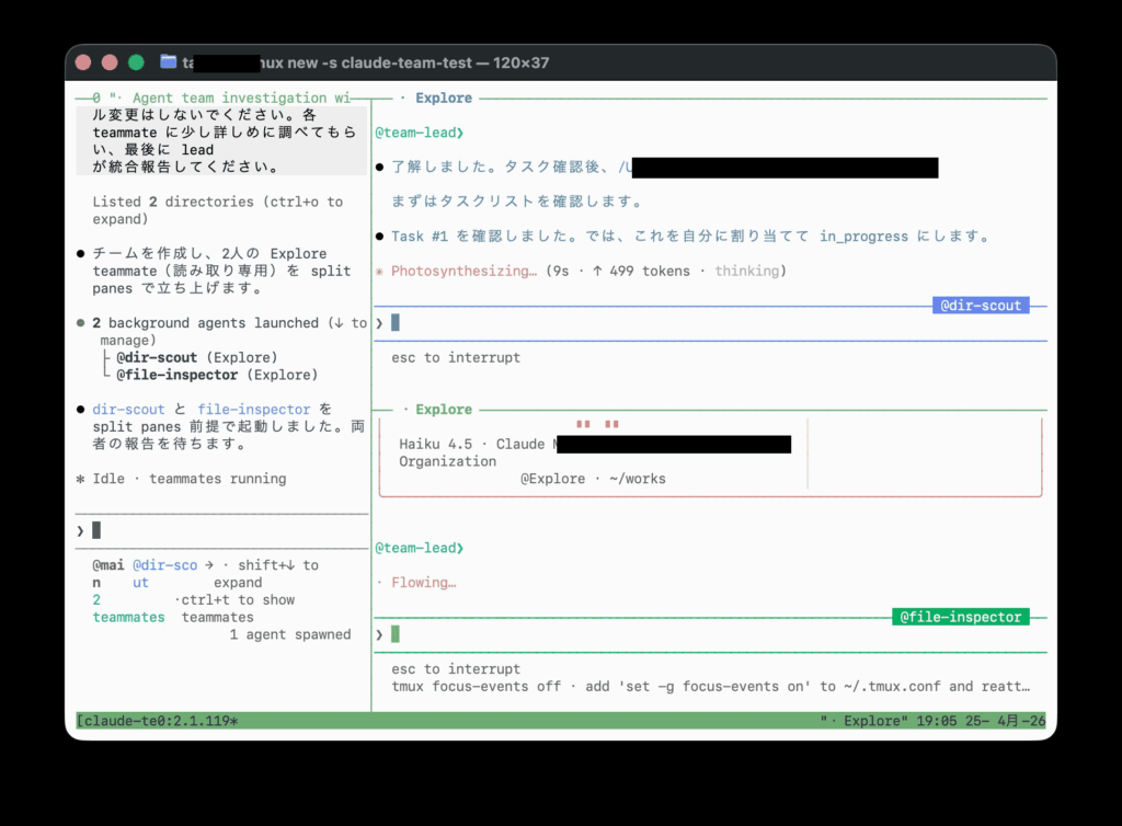 各 teammate(@dir-scout、@file-inspector)に役割が割り振られ、左側で @team-lead が指示出しと統合報告を行っているのが見て取れます。